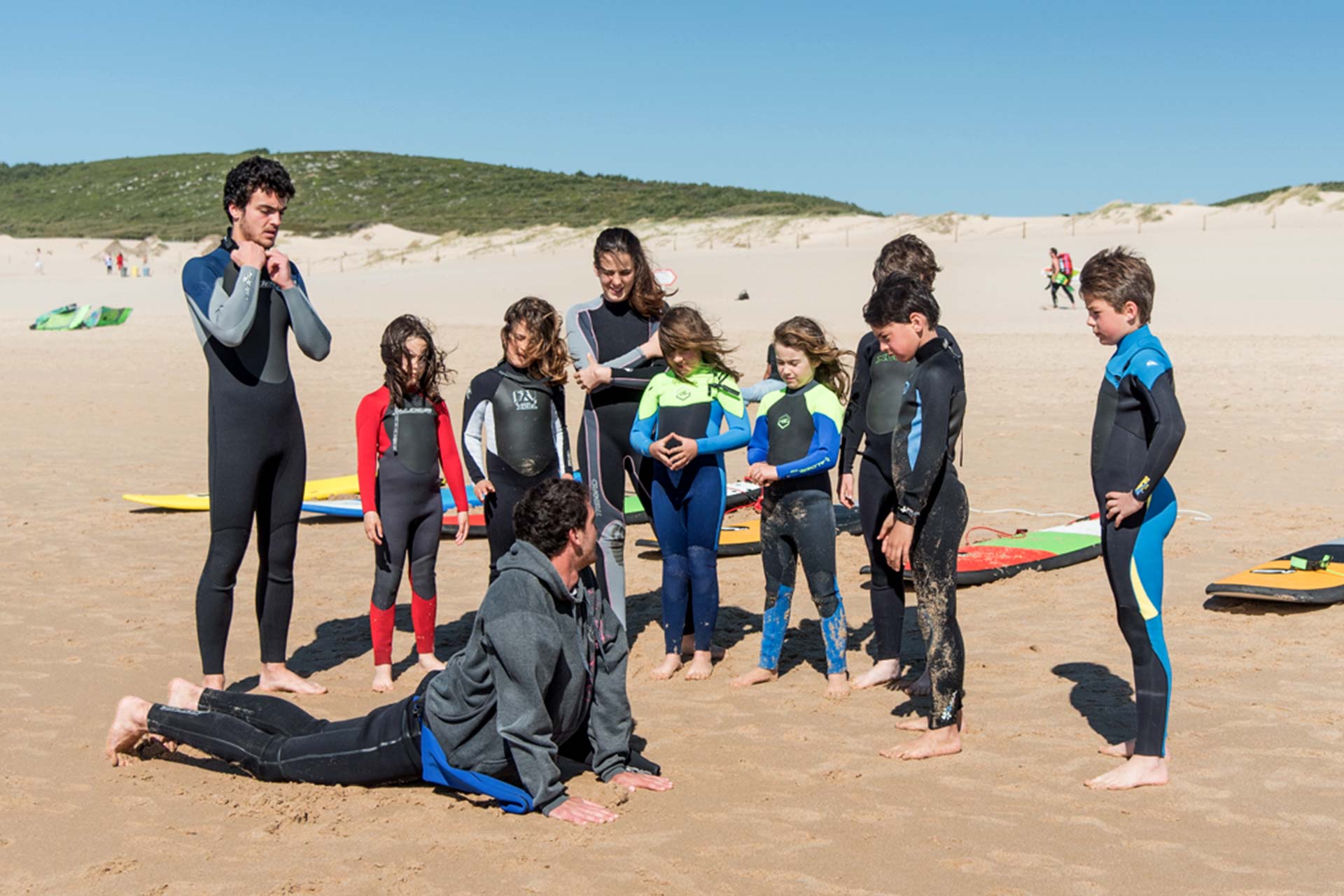 Surf lessons for children are aimed for kids from 6 to 14 years. However, we have suits available for ages 4 and up, as well as lighter and safer softboards, ideal for toddlers.